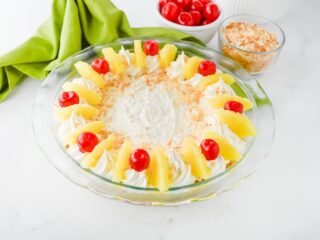 If you’re making the fluff for a party, follow the recipe directions but don’t add the optional toppings. Keep the fluff refrigerated for several hours prior to your special occasion. When you’re ready to serve, add the garnish and serve immediately!