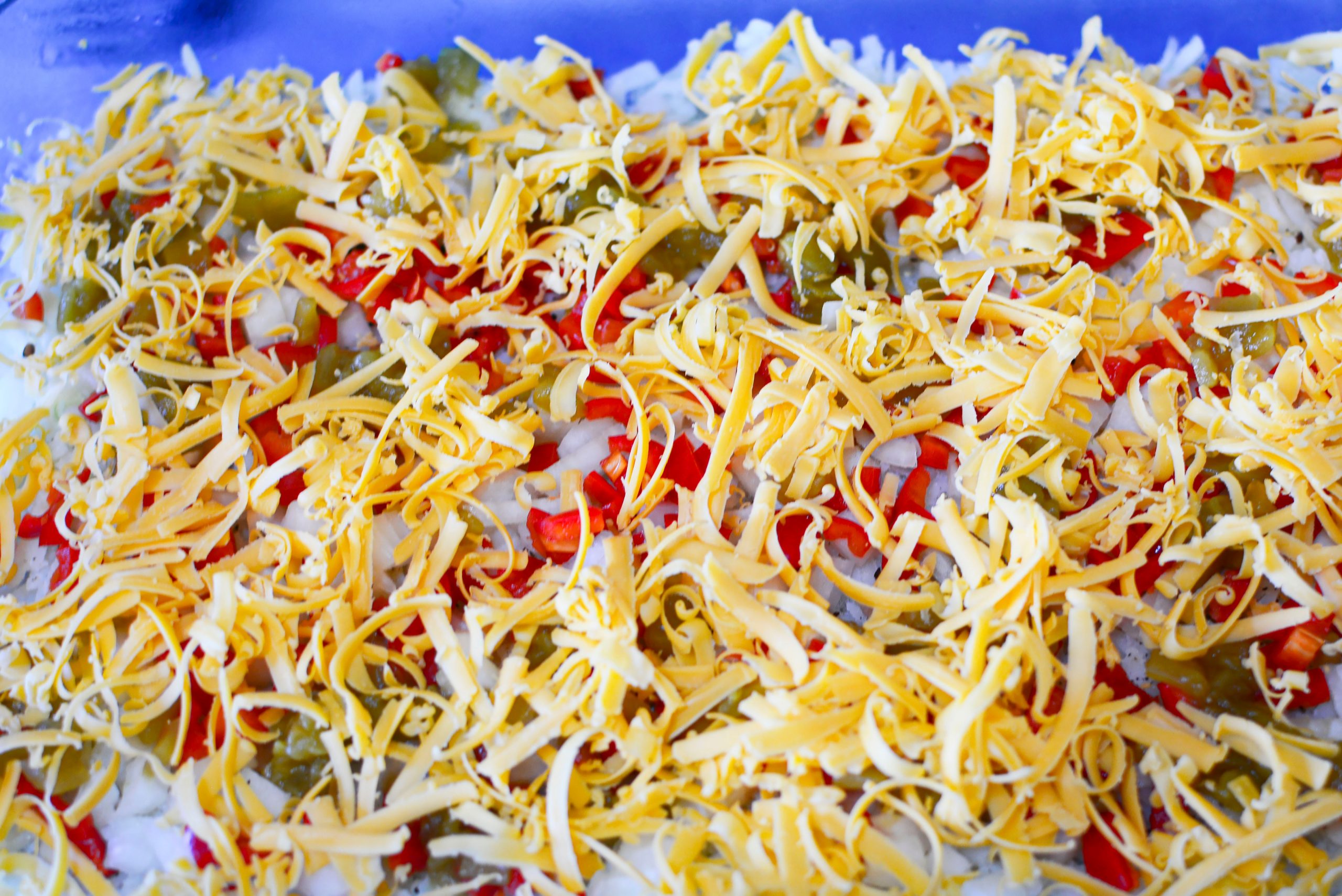 - Sprinkle the onion and red pepper over the potatoes. Add half the green chiles and about half of the cheese to the top. I