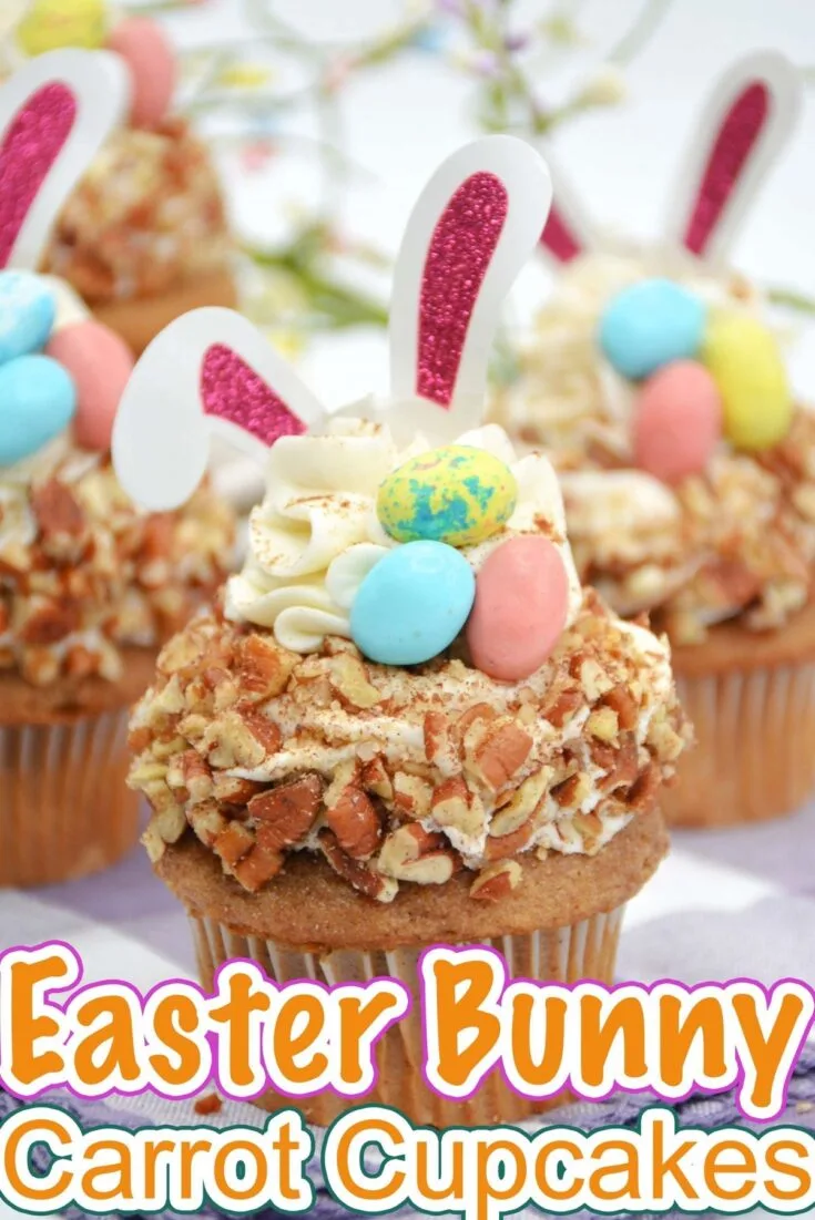 These Easter Bunny Carrot Cake Cupcakes are actually so easy to make by using box cake mix, then adding a homemade cream cheese frosting and cute bunny ears!
