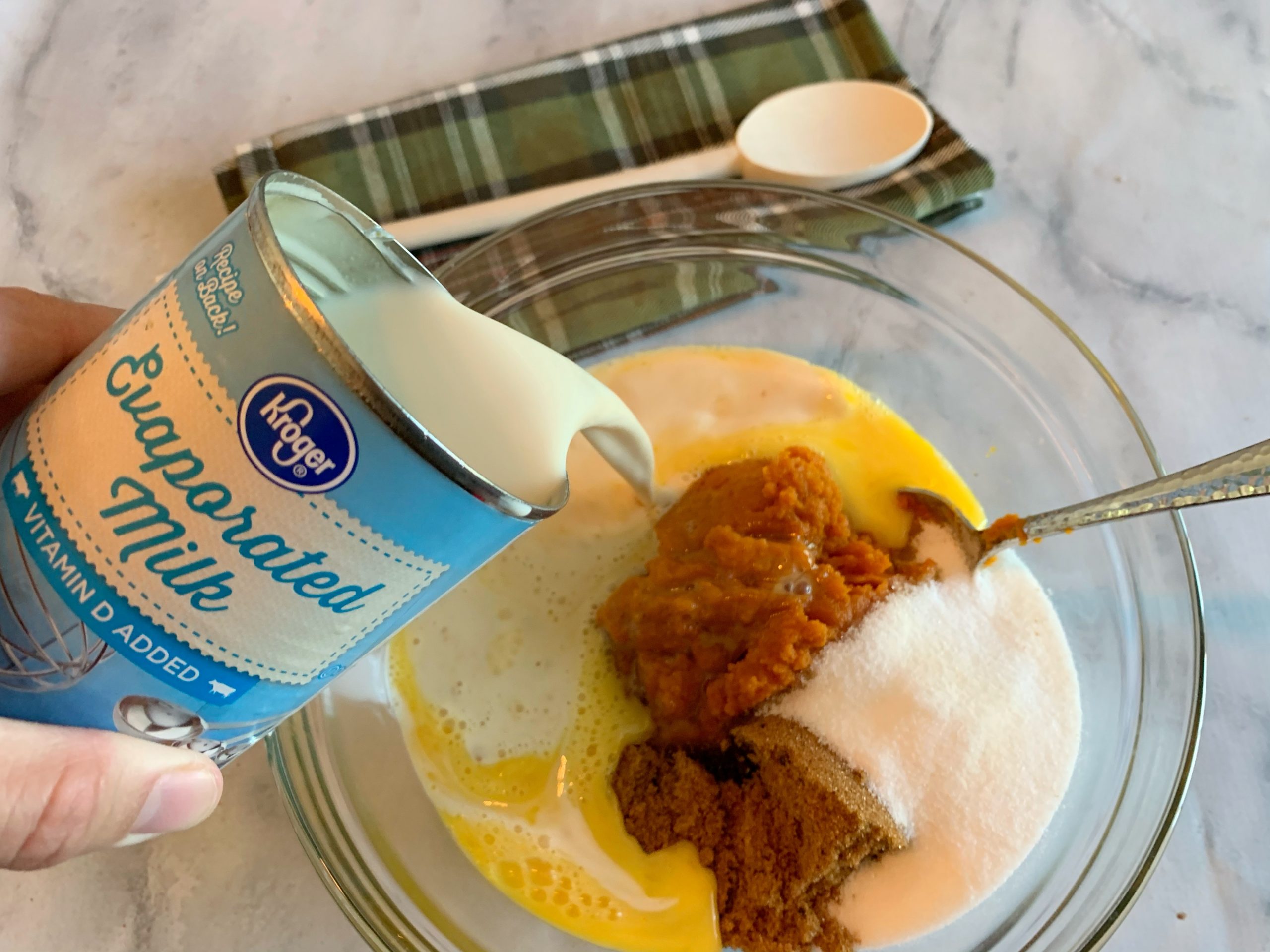2. In a large bowl, combine pumpkin puree, eggs, brown sugar, white sugar and milk.